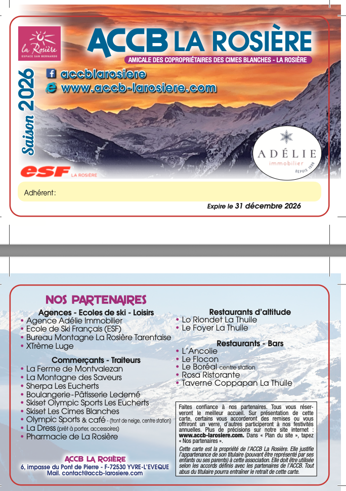 Depuis sa création, l’ACCB La Rosière a tissé des liens étroits avec plusieurs commerçants de La Rosière et de La Thuile. Des commerçants qui, pour certains, sont devenus des amis. La plupart d’entre eux consentent de petits avantages aux propriétaires des Cimes Blanches, membres de notre association, ou sont partenaires de nos manifestations. Bien normal, qu’en retour, on les mette en avant sur notre site et on incite tous nos adhérents à leur faire confiance. Rendez leur visite, vous ne serez pas déçus. La liste qui suit n’est bien sûr pas exhaustive. Nous la réactualiserons au fil des mois en fonction de vos remarques.…Lire la suite