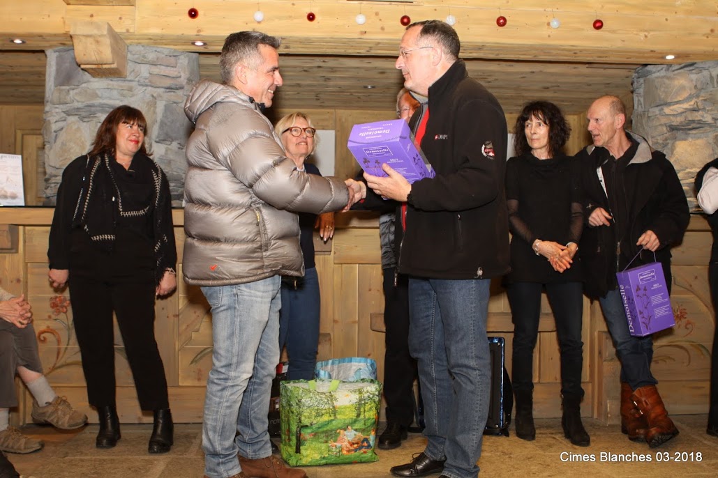 A 20h, la soirée Patrimoine-Le Flocon débutait aux Cimes Blanches avec une première prestation des chanteurs de La Voix des Alpages et de leurs deux accordéonistes Christophe et Rémi. Puis c’était la remise des prix du rallye et la passation de pouvoir au sein de la famille Leclercq, Céline et son mari Florent, recevant des mains de leurs parents, Isabelle et Didier, vainqueurs en 2017, le fameux chamois de bois ainsi que, comme tous les autres concurrents, des cadeaux de nos partenaires, notamment de Marc Pirard (Ski set) , Sabine et Jean-Charles Belle (Pharmacie de La Rosière), Jean-Baptiste Grangeon (Carrefour Montagne), ESF, etc.