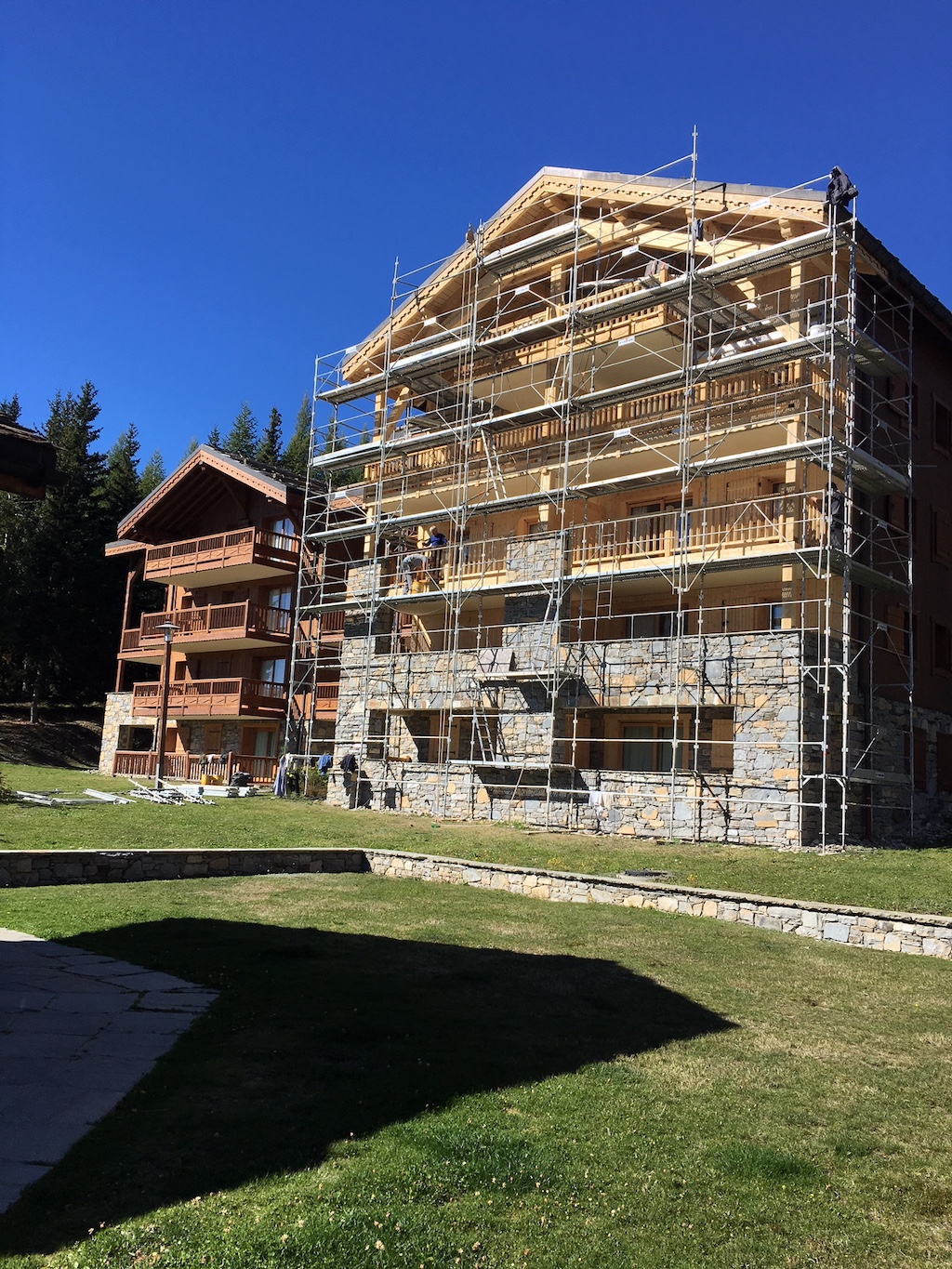 Une partie des échafaudages est déjà installé devant le chalet B. Suivra la façade du sud du A et, si le temps se maintient au beau, tout devrait être terminé début novembre.