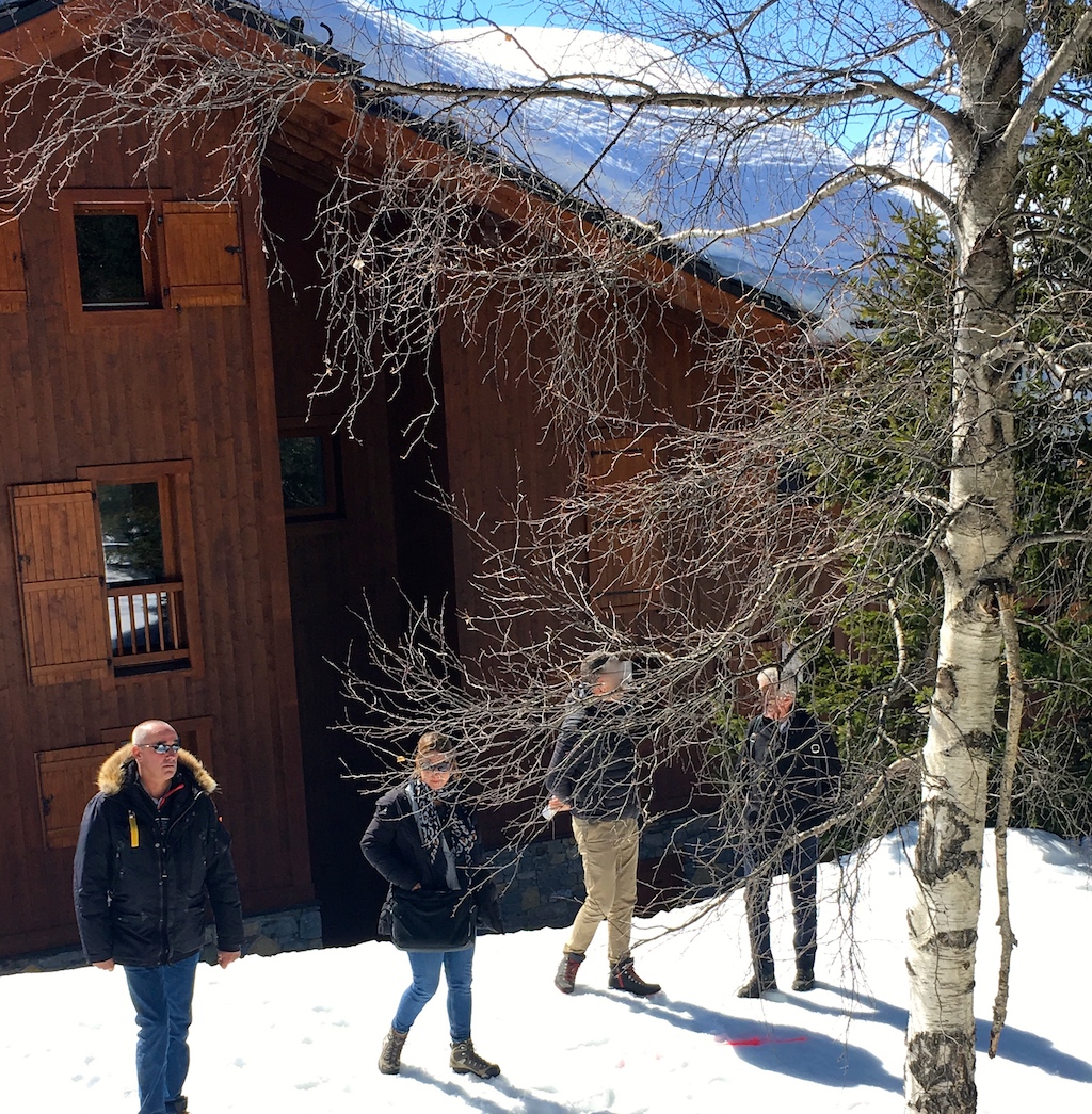 Juste devant ces personnes, une trace rouge, à 15 mètres de la façade nord du chalet F des Cimes Blanches. Dans le projet Odalys le mur d’une piscine est programmé à cet endroit.