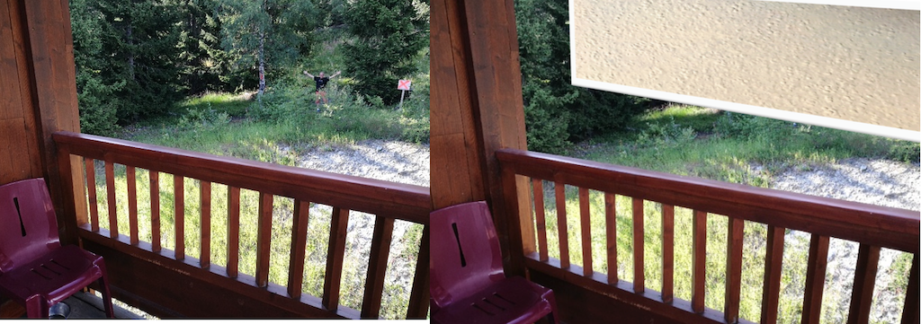 Sur ces deux photos prises du même appartement ,dans le chalet F des Cimes Blanches, à gauche, la vue actuelle sur la forêt. A droite nous avons matérialisé le mur qui s’élèvera à 15 mètres de ce balcon…