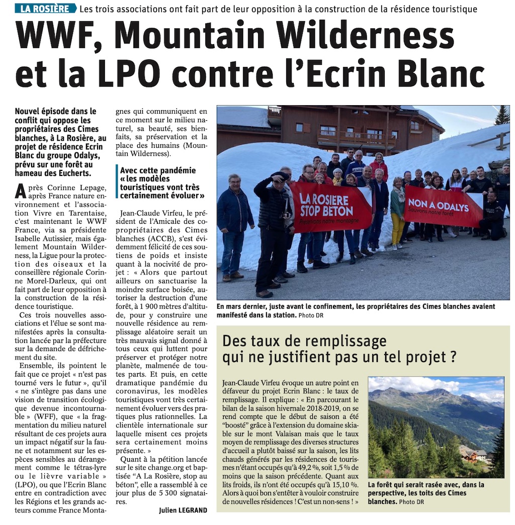 Après France Nature Environnement et Vivre en Tarentaise, Isabelle Autissier, présidente de WWF France, Moutain Wilderness et la Ligue de Protection des Oiseaux, trois autres poids lourds de la protection de l’Environnement en France, se sont clairement prononcés contre la construction de la résidence de Tourisme, l’Ecrin Blanc d’Odalys, à La Rosière-Montvalezan en Savoie. Également signataire d’une opposition auprès de la Préfecture de Savoie, la conseillère régionale Corinne Morel-Darieux.